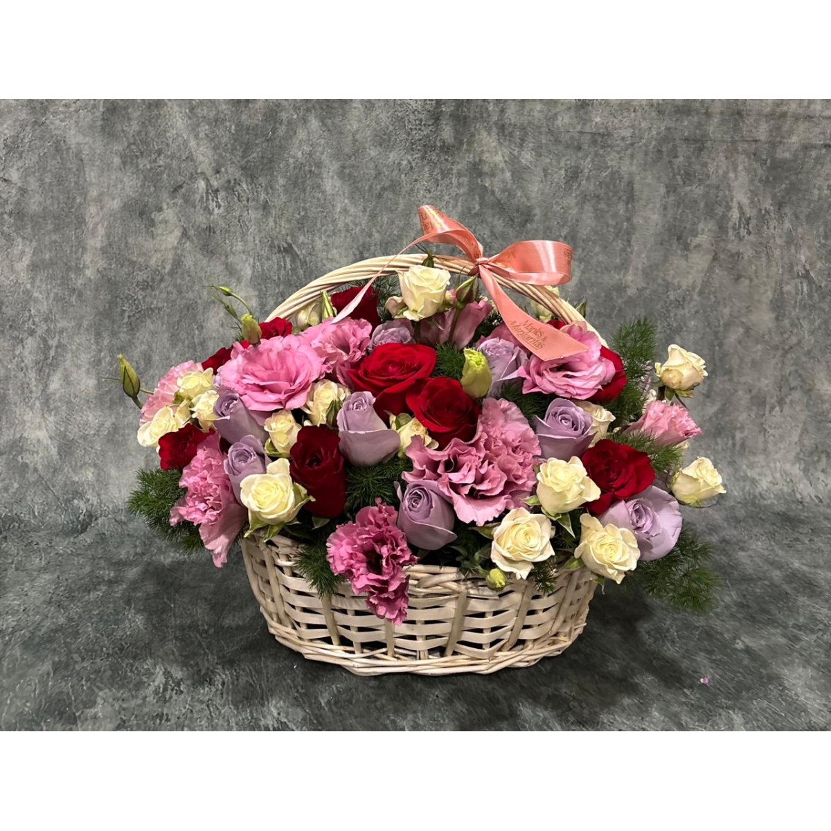 Hermoso arreglo primaveral en canasta con flores en tonos pastel, mezcla de rosas, lisiantus y otras flores segun disponibilidad.